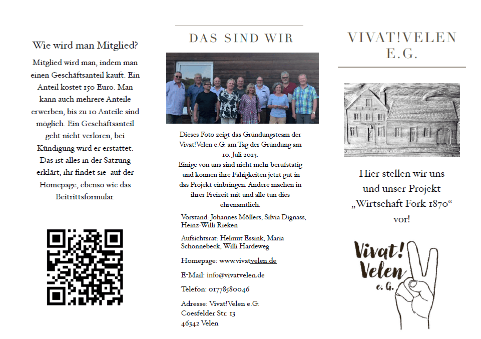 Am 2. + 3. September findet eine Informationsveranstaltung zur Genossenschaftsgründung statt. Adresse: Wirtschaft Fork – Vivat!Velen e.G., Coesfelder Straße 13, 46342 Velen