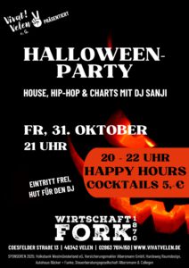 Am Freitag, den 31.10.2025 kommen sowohl Halloween-Fans sowie Tanzfreudige bei uns auf ihre Kosten! Freut euch auf eine ausgelassene Halloweenparty mit DJ Sanji. Mit einer Mischung aus House, Hip-Hop & Charts sorgt er ab 21 Uhr für coole Musik! Der Eintritt ist frei, für den DJ geht wie gewohnt ein Hut rum. Also kommt vorbei – gerne natürlich auch mit Verkleidung! 🙂