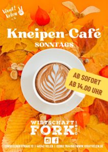 Langsam werden die Tage dunkler und kälter. Was gibt es da Schöneres, als leckeren Kuchen und Café in netter Gesellschaft zu genießen? Für noch mehr schöne gemeinsame Zeit öffnet unser Kneipen-Café sonntags in der dunklen Jahreszeit schon ab 14.00 Uhr. Wir freuen uns auf euren Besuch!