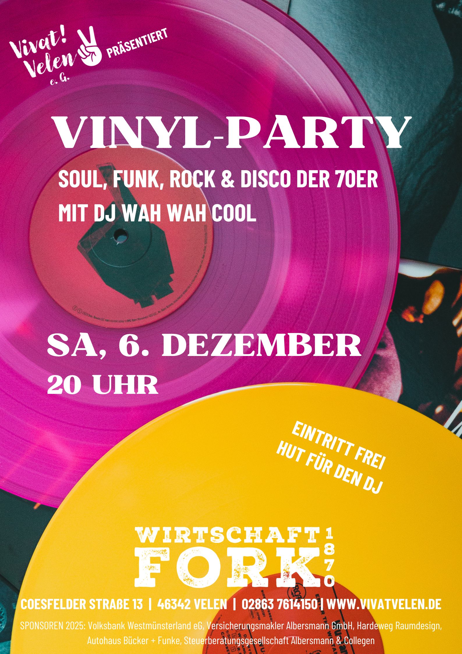 Es ist wieder an der Zeit – die nächste Vinyl-Party steigt! Am Samstag, den 06.12.2025 ab 20.00 Uhr kann wieder ordentlich abgezappelt werden. DJ Wah wah cool hat eine bunte Mischung aus Soul, Funk, Rock und Discomusik der 1970er und 1980er im Gepäck. Der Eintritt ist frei, es wird jedoch wie gewohnt ein Spendenhut für den DJ herumgehen. Also: Schmeißt euch in Schale und kommt rum! 🙂
