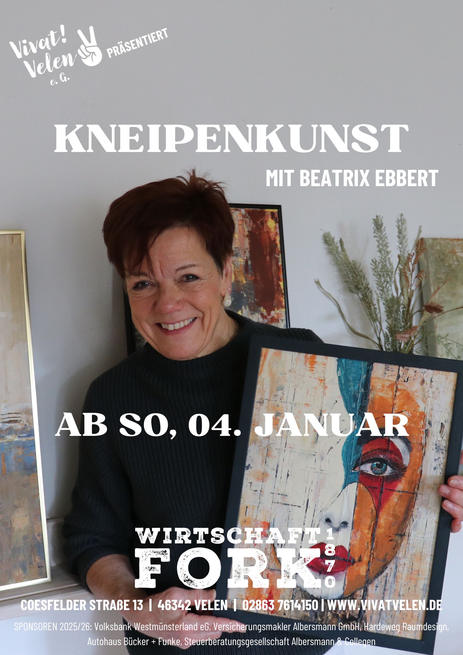 Ab Sonntag, den 04.01.2026 gibt es in unserer Wirtschaft Fork 1870 wieder Kneipenkunst zu bewundern: Die in Hamminkeln ansässige Künstlerin Beatrix Ebbert stellt eine Auswahl ihrer vielfältigen Gemälde bei uns aus – die bei Interesse auch käuflich zu erwerben sind. Euch erwarten die verschiedensten Techniken und Motive. Am Sonntag könnt ihr die Ausstellung bei Kaffee und Kuchen bewundern, doch gastiert sie natürlich noch etwas länger bei uns. Schaut gerne mal vorbei! 🙂