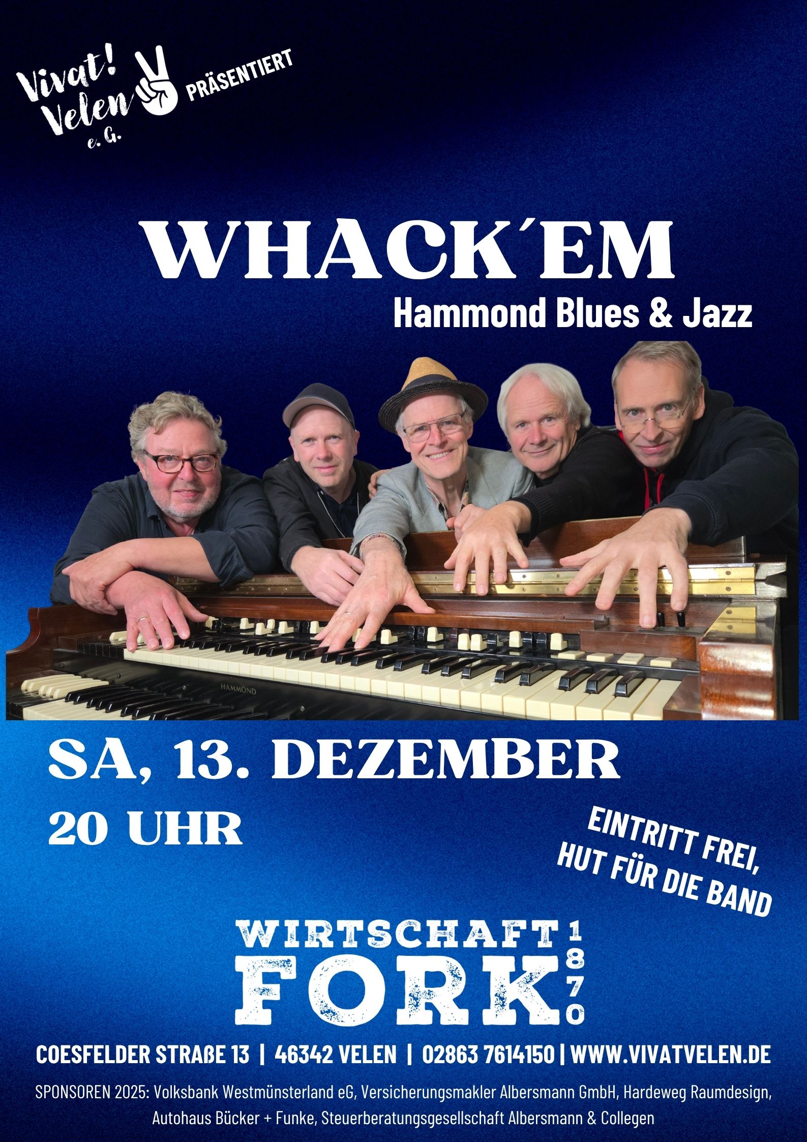 Am Samstag, den 13.12.2025 erwartet unsere Gäste mit der Band „Whack´em“ satter Hammond Blues und Jazzsound.