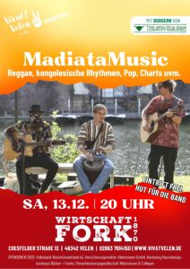 Nachdem die Band „Whack´em“ ihren geplanten Auftritt leider kurzfristig absagen musste, freuen wir uns sehr, „MadiataMusic“ am Samstag, den 13.12.2025 begrüßen zu dürfen. Ab 20.00 Uhr erwartet euch eine bunte Mischung aus Pop, Charts afrikanischen Beats, eigenen Songs uvm. Neben guter Musik und erfrischenden Getränken erwarten euch zudem noch leckere Tiergarten Highländer-Burger. Der Eintritt ist frei, es geht aber ein Spendenhut für die Band herum. Weitere Informationen rund um die Band erhaltet ihr auf deren Homepage unter www.madiatamusic.com.
