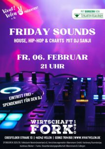 Am Freitag, den 06.02.2026 ist es wieder soweit: Ab 21 Uhr bringt DJ Sanji mit einer Mischung aus House, Hip-Hop & Charts die Friday Sounds in unsere Wirtschaft Fork 1870. Also schnapp dir deine Jungs und Mädels und komm vorbei!