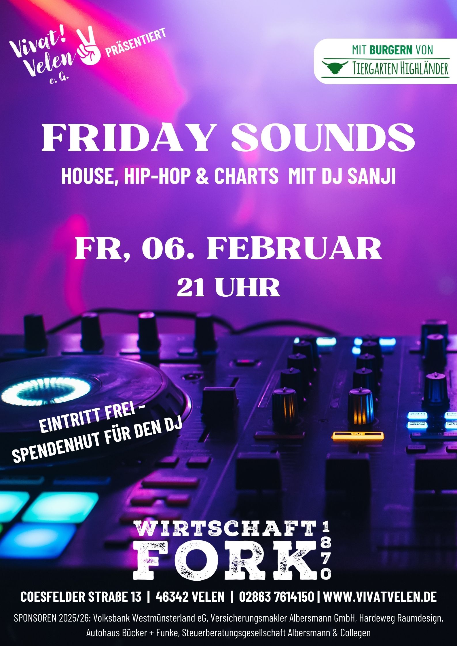Am Freitag, den 06.02.2026 ist es wieder soweit: Ab 21 Uhr bringt DJ Sanji mit einer Mischung aus House, Hip-Hop & Charts die Friday Sounds in unsere Wirtschaft Fork 1870. Also schnapp dir deine Jungs und Mädels und komm vorbei!