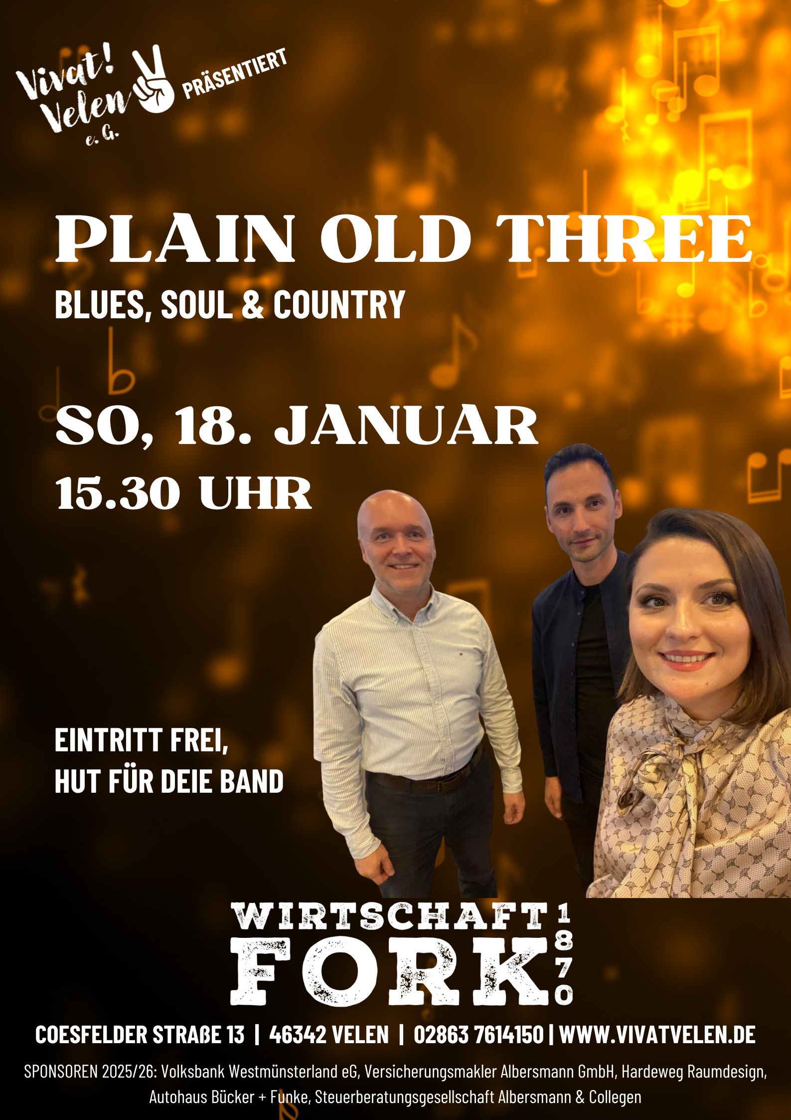 Am Sonntag, den 18.01.2026 sorgt die Band „Old Plain Three” ab 15.30 Uhr mit einer Mischung aus Blues, Pop, Soul und Country für eine stimmungsvolle Atmosphäre. Das Trio aus Sängerin Edlira Harapi, Gitarrist Benedikt Winkler und Schlagzeuger Elton Harapi präsentiert eine genreübergreifende Mischung aus Coverstücken und eigenen Songs und verbindet emotionale Tiefe mit einem zeitgemäßen Klang.