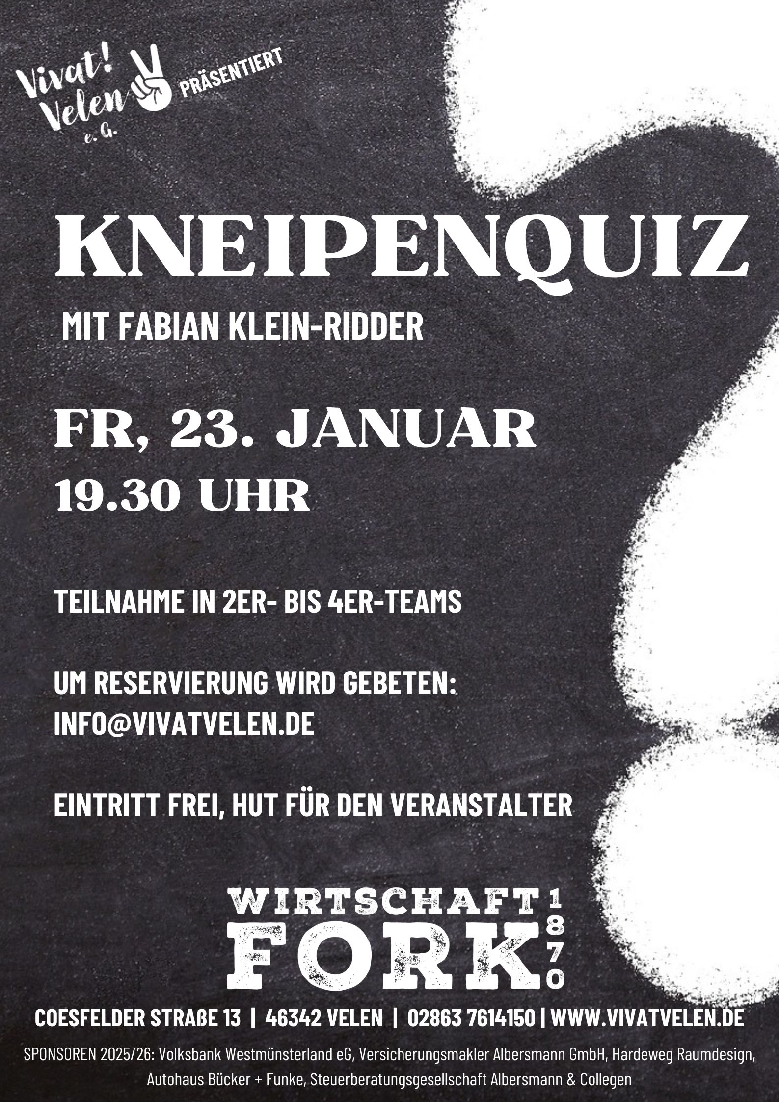 Am Freitag, den 23.01.2026 findet unser nächstes Kneipenquiz statt. Ab 19.30 Uhr führt Fabian Klein-Ridder mit kniffligen Fragen durch den Abend. Testet eurer Allgemeinwissen in 2er- oder 4er-Teams und reserviert euch schnell einen Platz – entweder telefonisch über unsere Nummer 02863 7614150, per E-Mail an info@vivatvelen.de oder über unser Kontaktformuar über unsere Homepage www.vivatvelen.de.