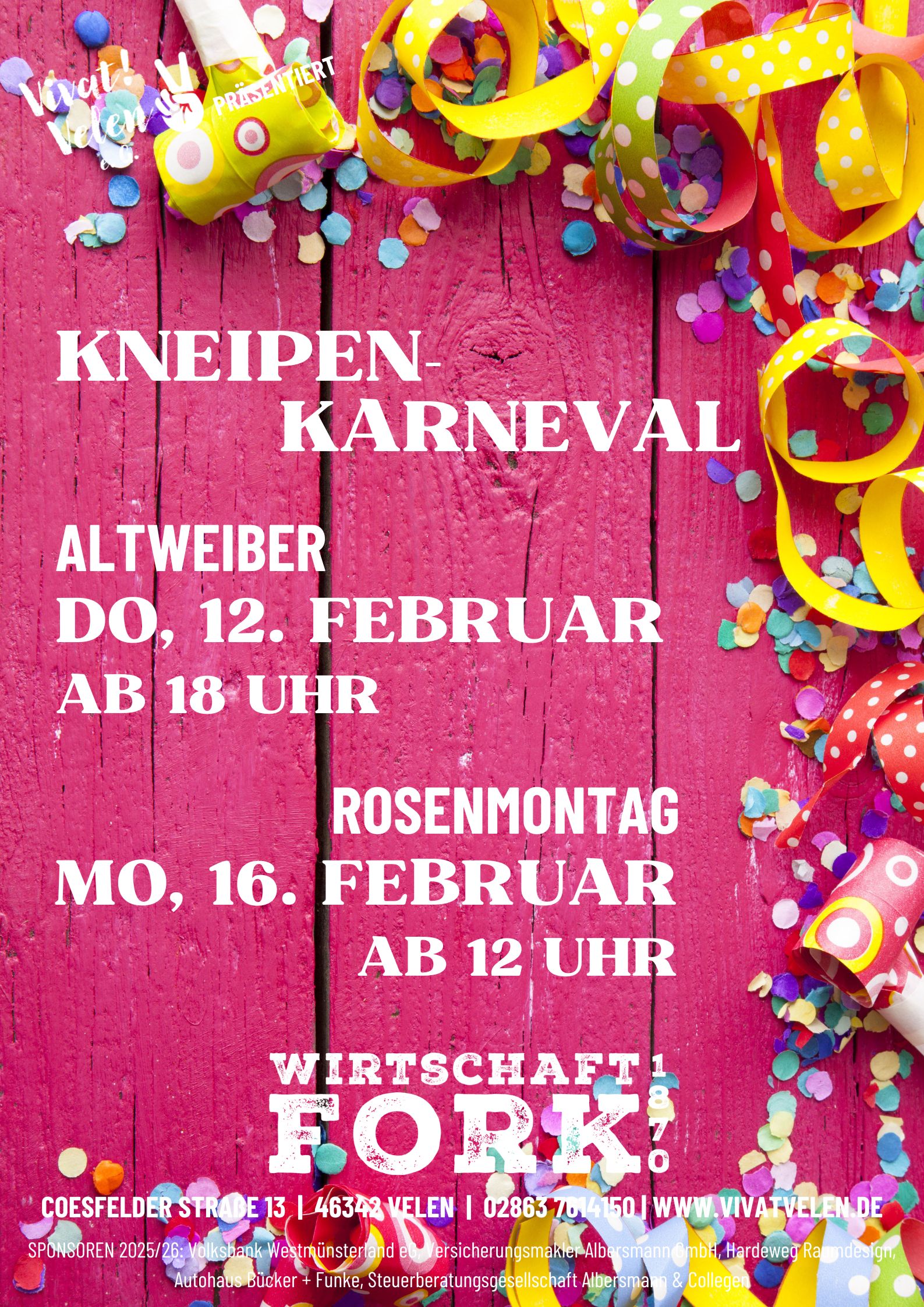 Liebe Jecken, wir laden euch ganz herzlich ein zum Kneipen-Karneval! An Altweiber (12.02.2026) freuen wir uns ab 18.00 Uhr auf euch. An Rosenmontag (16.02.2026) öffnen wir die Türen schon ab 12.00 Uhr. 🙂 Hintergrundbild © Canva Aktuelles Das könnte dich auch interessieren Veranstaltungen & Termine 4. Februar 20264. Februar 2026 15.02.2026 | 15 Uhr Der erste Karnevalsumzug in Velen – Filmnachmittag mit Heinz Büning 1. Februar 2026 06.02.2026 | 21 Uhr Friday Sounds mit DJ Sanji (House, Hip-Hop, Charts) 25. Januar 2026