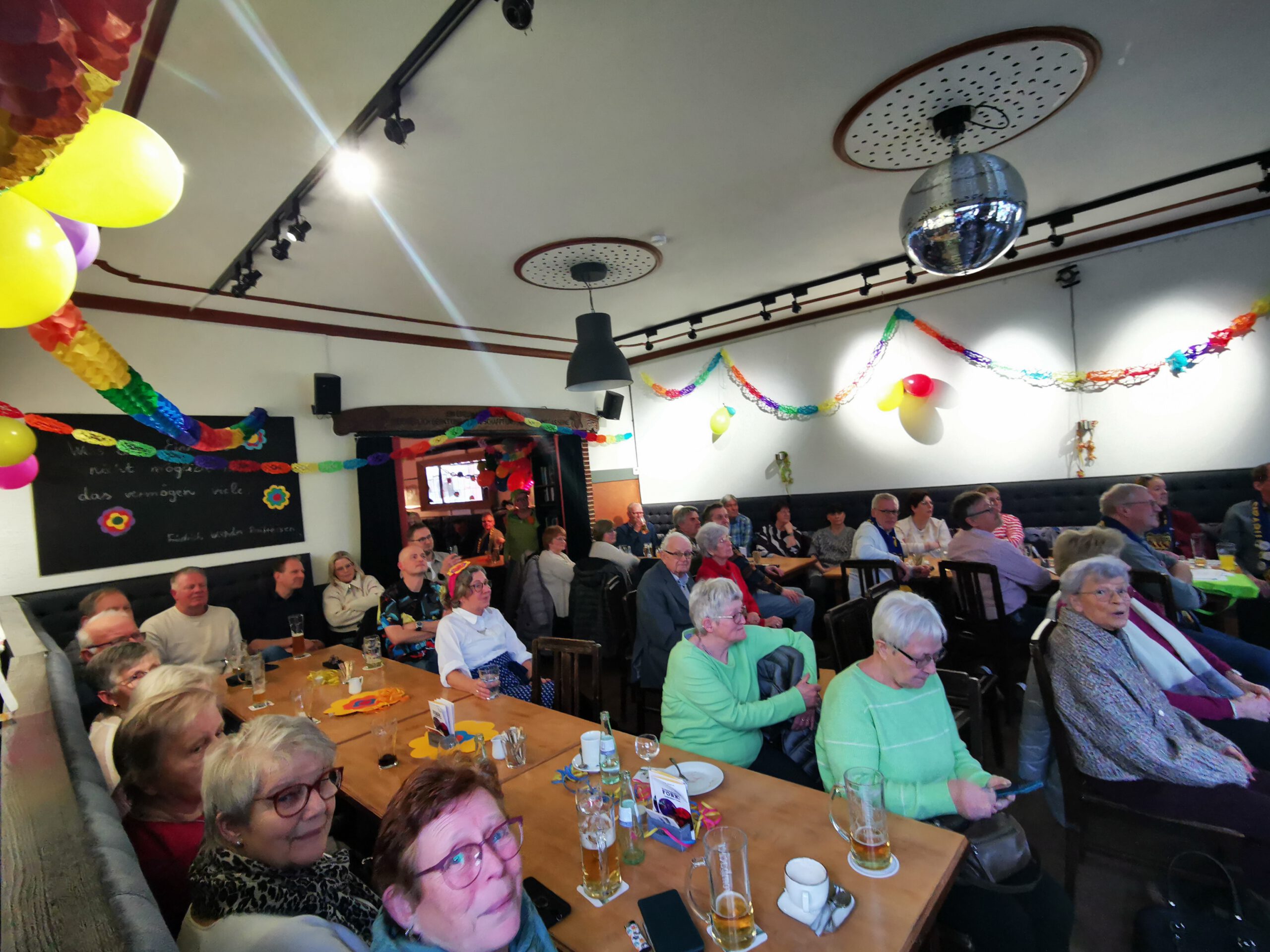 Das war wirklich “emVelenswert”: Saal und Kneipe in der Wirtschaft Fork 1870 waren gut gefüllt, als Heinz Büning am Karnevalssonntag gut zwei Stunden lang einen seiner zahlreichen Film-Schätze zeigte. Im Mittelpunkt der Filmvorführung stand der erste Velener Rosenmontagszug, der 1998 unter dem Motto “emVelenswert” durch die Straßen Velens zog. Der ein oder andere erkannte sich oder gute Bekannte und Verwandte auf dem Bildschirm wieder – und erinnerte sich gerne an die Anfänge des organisierten Straßenkarnevals vor knapp 30 Jahren. Mit einem kleinen Präsent sagte die Genossenschaft Vivat!Velen nach einer gelungenen Veranstaltung Danke bei Heinz Büning, der hoffentlich noch öfter Schätze aus seinem Archiv in der Genossenschaftskneipe zeigen wird.