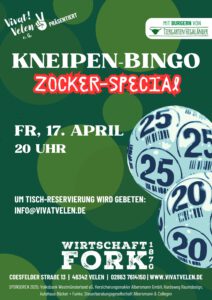 Zeit für die nächste Runde Bingo! Fordert euer Glück heraus und kommt vorbei am Freitag, den 17.04.2026 ab 20 Uhr zum Kneipen-Bingo – Zocker-Special. Danach geht unsere Bingo-Reihe erst einmal in die Sommerpause, bevor euch ab Herbst weitere Termine erwarten. Also sichert euch einen Tisch und ergattert einen von vielen kleineren und größeren Gewinnen! Auch mit dabei sind „Tiergarten Highländer“ mit ihren leckeren Burgern. Der Eintritt ist wie gewohnt frei, es geht ein Spendenhut für den Veranstalter rum.