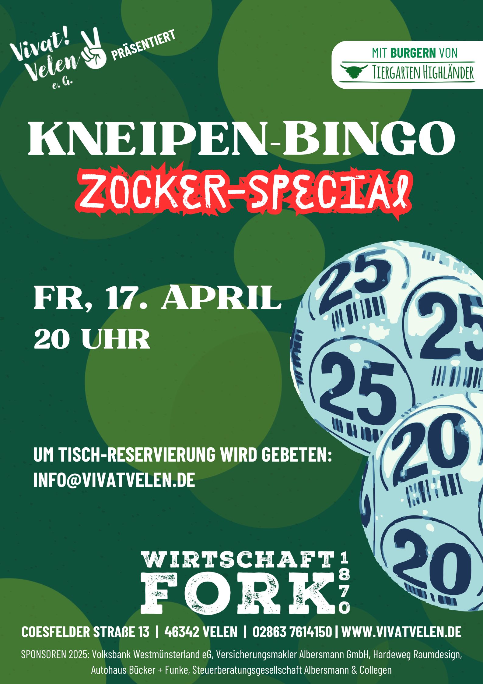 Tisch-Reservierungen bitte vorab telefonisch unter 02863 7614150, per E-Mail an info@vivatvelen.de oder über unser Kontaktformular auf unserer Homepage www.vivatvelen.de.
