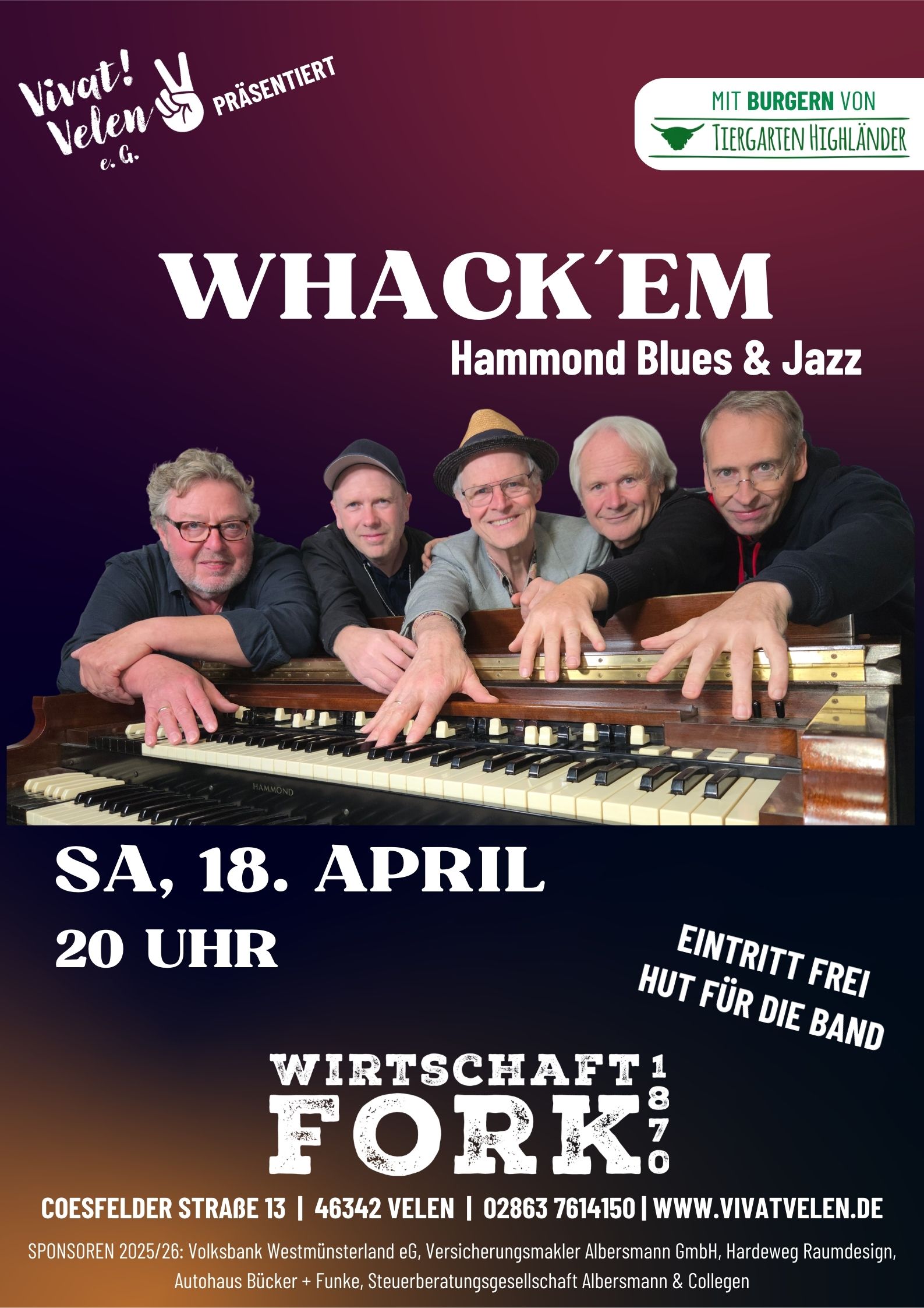 Nachdem der ursprünglich geplante Termin im Dezember leider ausfallen musste, freuen wir uns sehr, am Samstag, den 18.04.2026 die Band „Whack´em“ bei uns in der Wirtschaft Fork 1870 begrüßen zu dürfen! Freut euch auf eine ordentliche Portion sattem Hammond Blues und Jazzsound – ganz nach dem Motto des Bandnamens, der so viel bedeutet wie „Gib Gas“ oder auch „Gib´s ihm“.