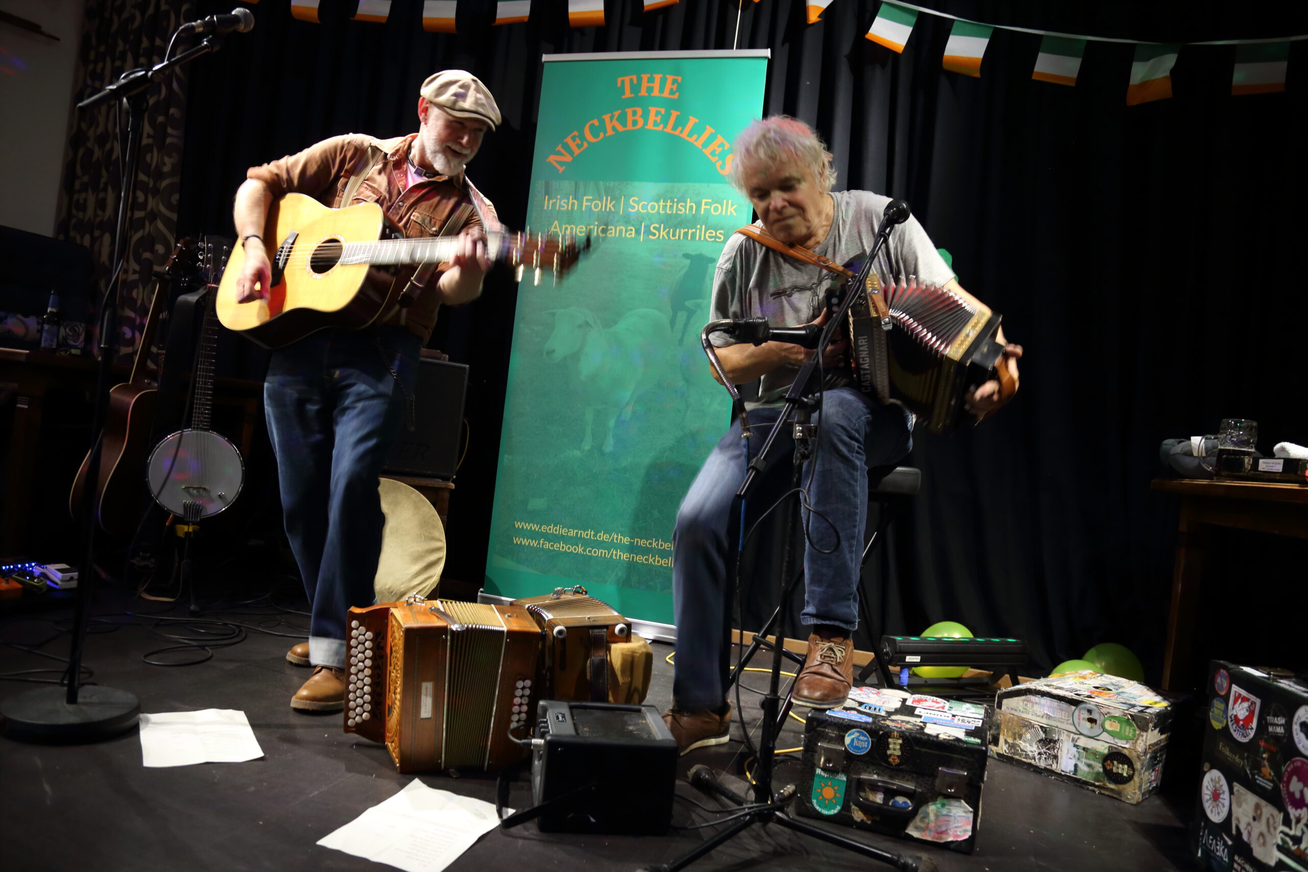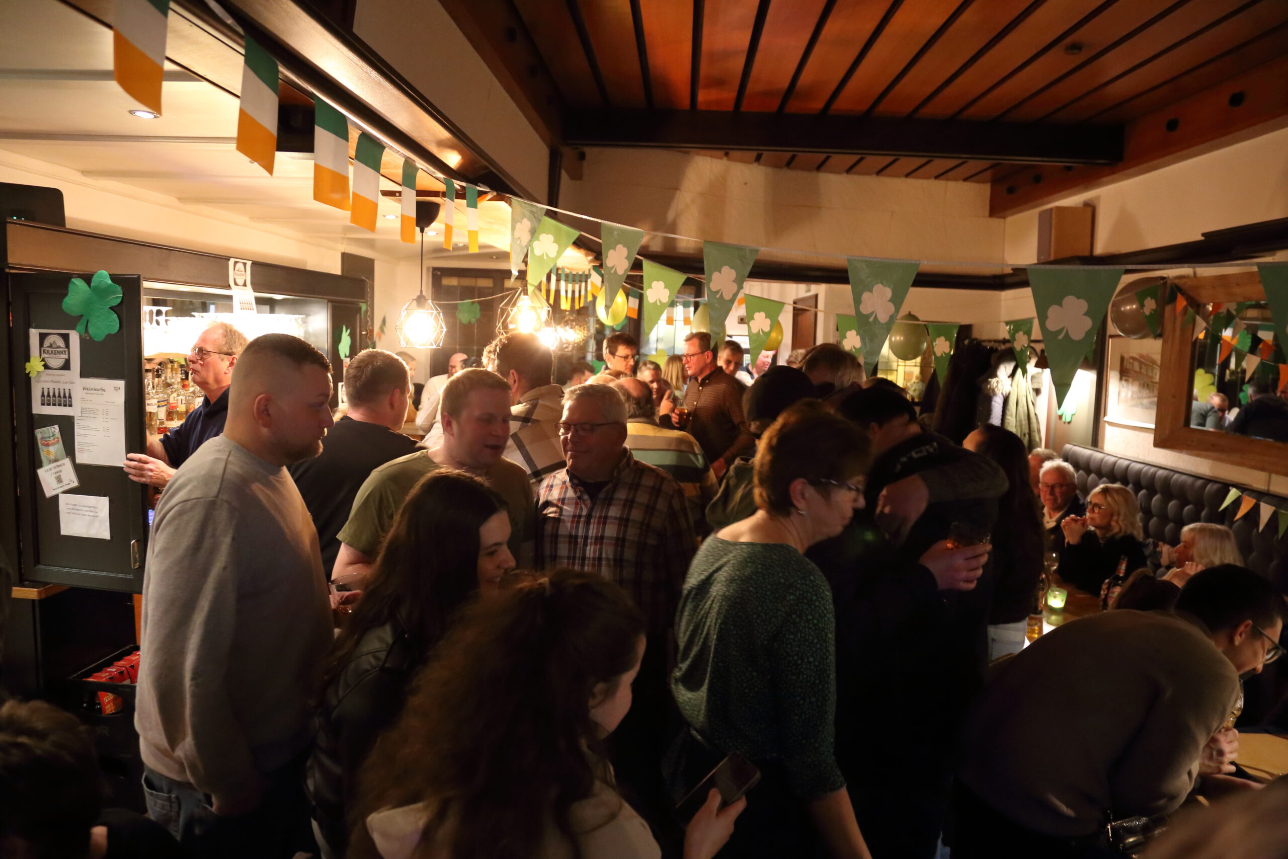 Eine Stimmung wie in einem irischen Pub herrschte in der rappelvollen Wirtschaft Fork 1870 beim St. Patrick’s Day am Samstag (14. März). Dafür sorgten in allererster Linie die Musiker von den „Neckbellies“, die mit handgemachtem Irish Folk, energiegeladener Pub-Musik, aber auch stimmungsvollen Balladen und Cover-Stücken das Publikum ruckzuck in allerbeste Feierlaune versetzten. Auch das Kilkenny-Bier und die tolle Deko mit jeder Menge Kleeblättern und irischen Flaggen sorgten dafür, dass auch die zweite Auflage des irischen Feiertages in der Genossenschaftskneipe zu einem großen Erfolg wurde. Thomas Hecking und Eddie Arndt hatten nicht nur viele irische Songs im Gepäck, sondern auch die ein oder andere Geschichte zu ihren Songs mitgebracht, die sie mit traditionellen irischen Instrumenten wie der Rahmentrommel, der Tin Whistle und dem sechssaitigen Banjo vortrugen.