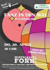 Kommt vorbei und tanzt mit uns in den Mai – am Donnerstag, den 30.04.2026 holt DJ Wah wah cool ab 20 Uhr seine Vinyl-Platten heraus und heizt mit einer Mischung aus Soul, Funk, Rock und Discomusik der 1970er ordentlich ein. Solltet ihr zwischendurch eine Stärkung benötigen, stehen „Tiergarten Highländer“ mit ihren leckeren Burgern für euch bereit! Der Eintritt ist frei, es geht ein Spendenhut für den DJ herum.